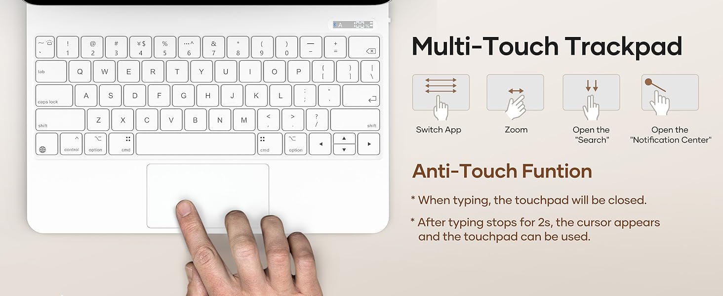• Multi-touch Trackpad: Use ultra-sensitive trackpad to navigate your iPad effortlessly with multi-touch gestures. It makes your work more efficient; The touchpad auto-closes when typing, avoiding accidental touches for a smooth experience