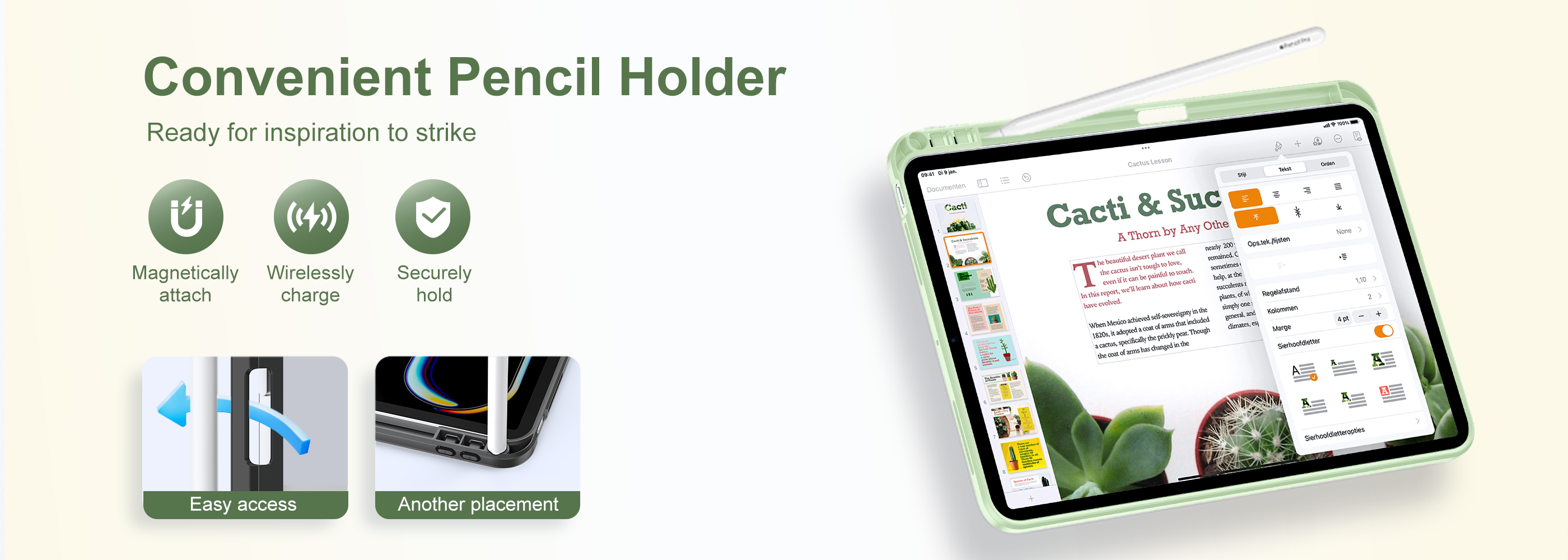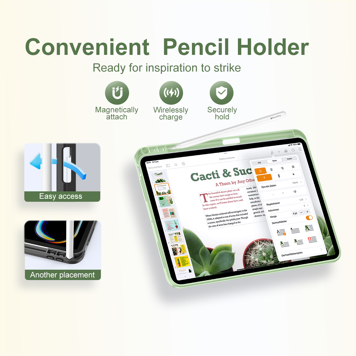 • Convenient Pencil Holder: This case with stand has a pencil holder for Apple Pencil users. No more worry about losing or having no place for the pencil. The holder provides dedicated storage, keeping the pencil always ready. It fully supports magnetic attachment and wireless charging between Pencil Pro and iPad for continuous use. There's a convenient hole on the pen slot. To use the Pencil, just put your finger through the hole to take it out easily