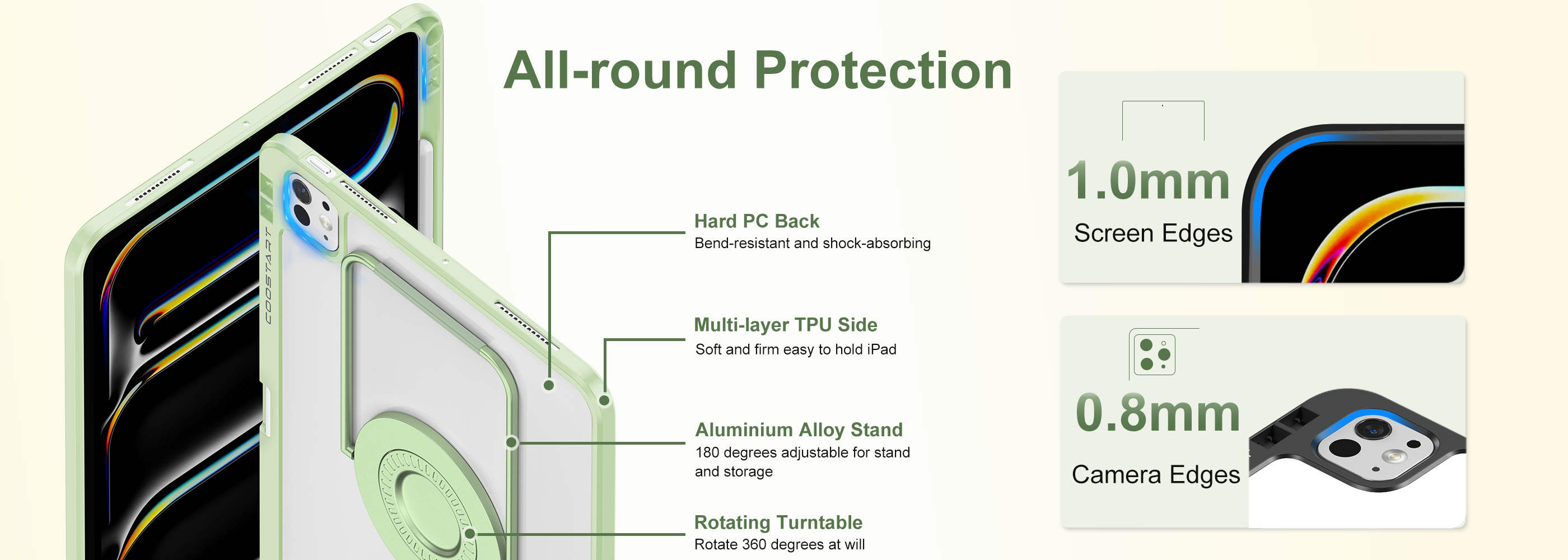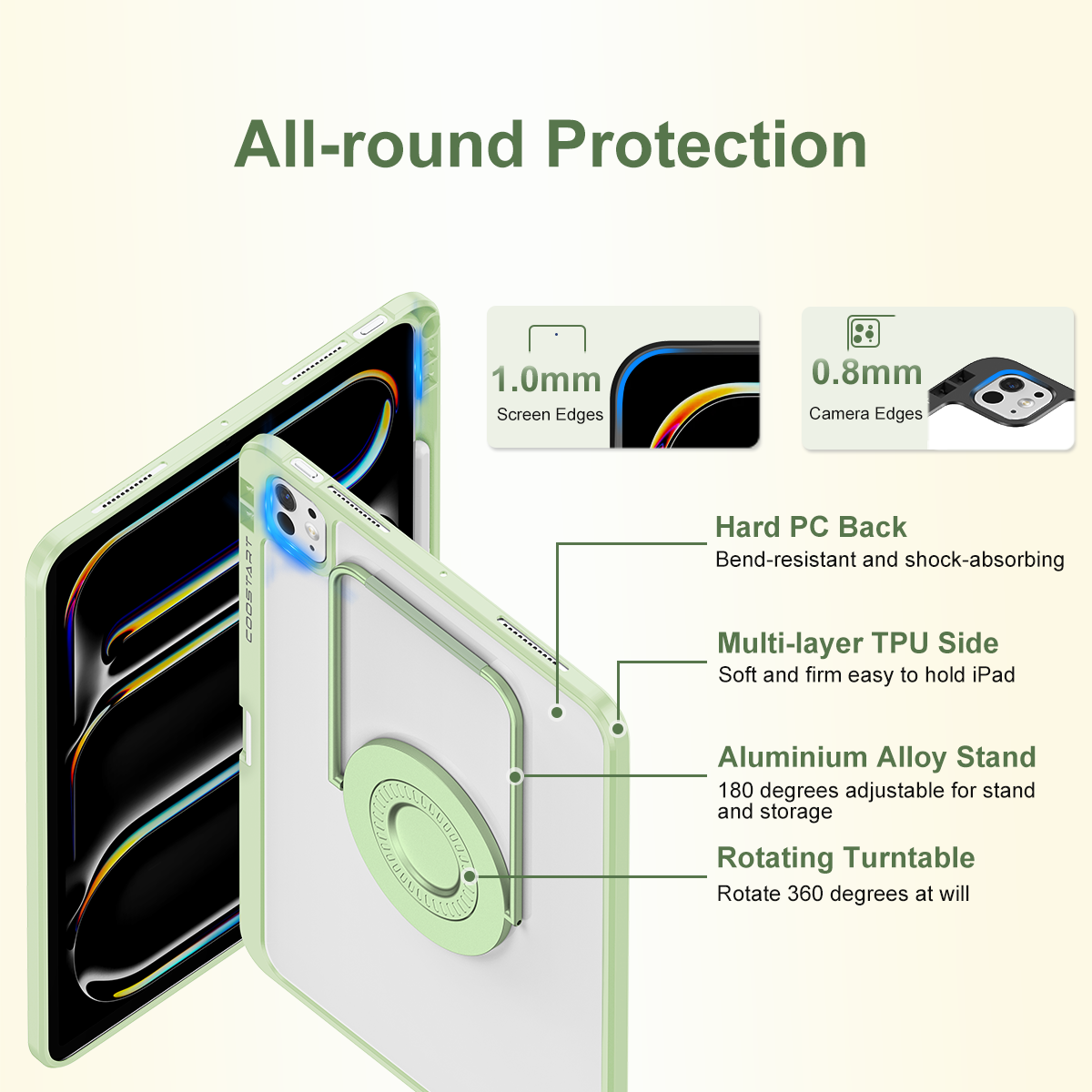 • All-Round Protection: The sturdy PC back panel acts as a solid shield to protect the back of iPad. And a flexible rubber bumper cushions it from external forces, making it easy to withstand daily wear and tear. Inside, built-in 360° shock-absorbing airbags keep your device safe and secure no matter how your iPad is dropped or bumped