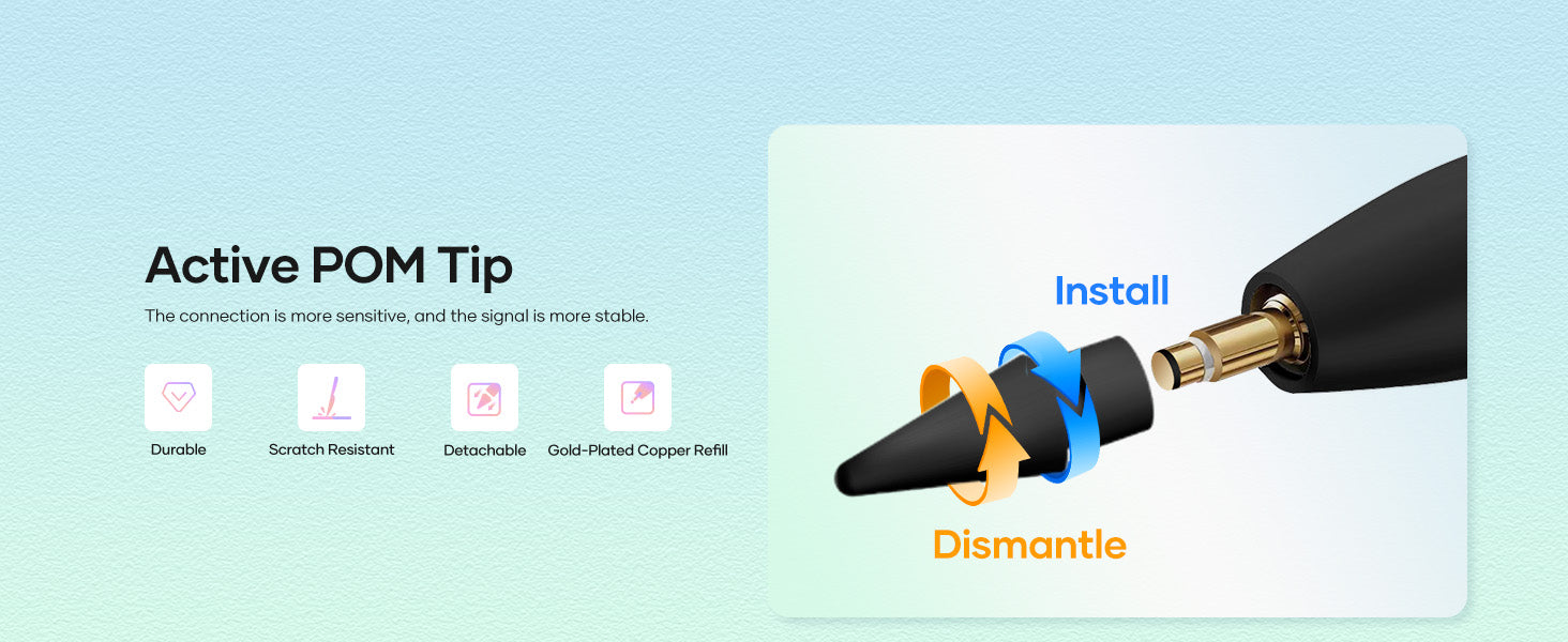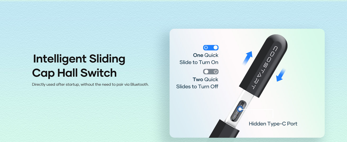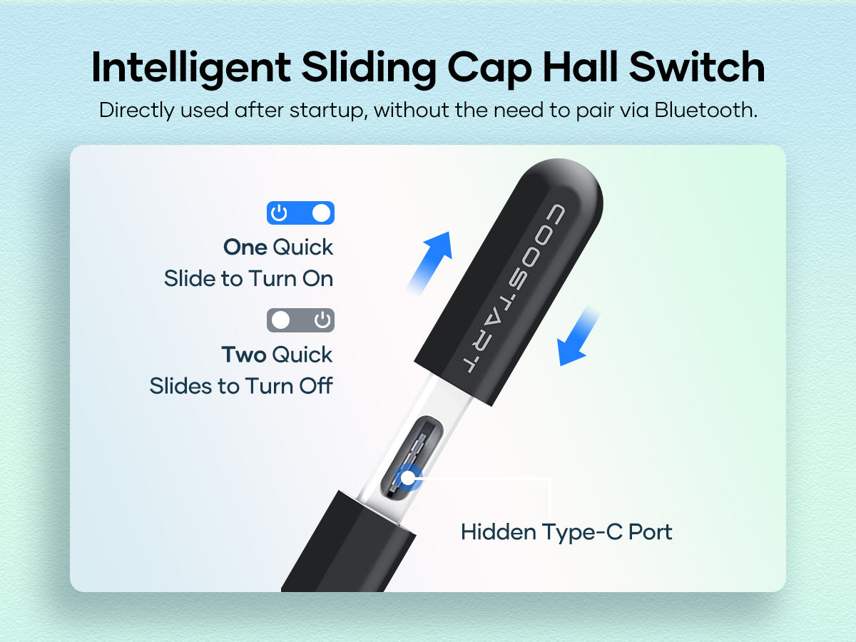 • Pen Cap Switch & Hidden Type-C Port: Directly used after startup. No Bluetooth pairing is needed. Slide the cap once to turn it on, and twice to turn it off. The concealed design protects the USB port and maintains the stylus' aesthetics