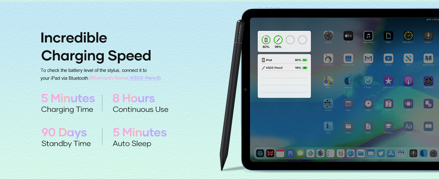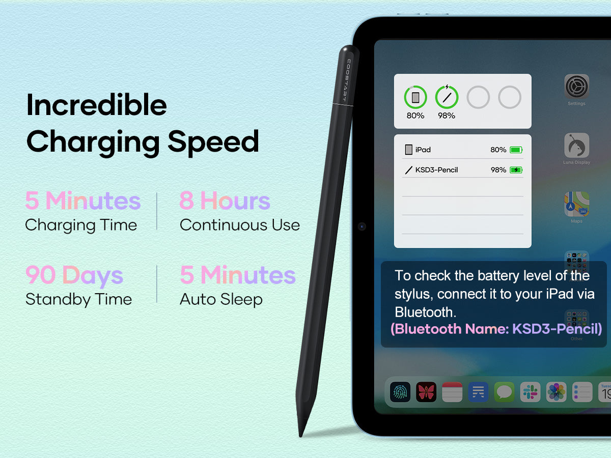 • 5-Minute 100% Charged & Long-Lasting: This stylus pen for iPad offers up to 8-10 hours of continuous use with just 5 minutes of charging. It automatically shuts off after 5 minutes of idle time and provides a standby time of up to 90 days. Once it is connected to the iPad via Bluetooth, you can check the stylus's battery level on the iPad's widget