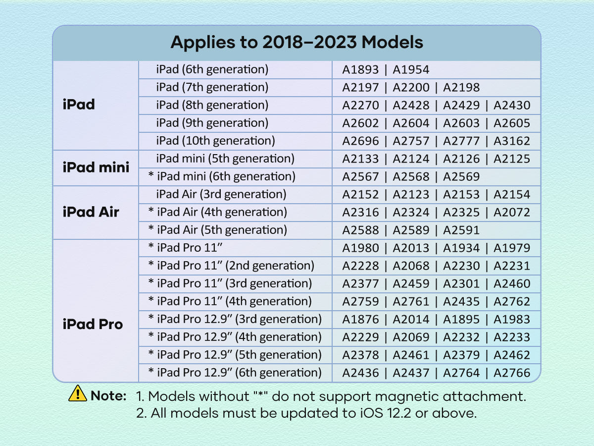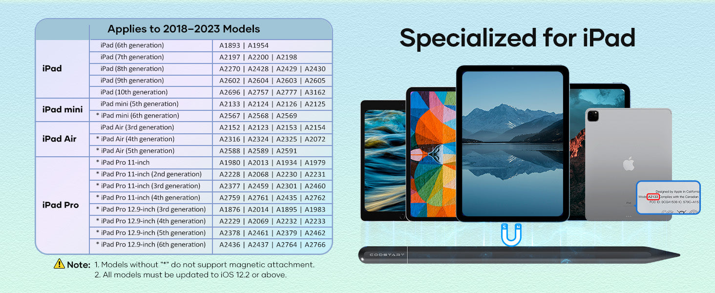 • Compatible with iPad 2018-2024: This stylus is a remarkable alternative for Apple Pencil 1st & 2nd gen.; specifically designed for iPad 10th Generation; for iPad 9th, 6th, 7th, 8th Gen.; for iPad Air 13-inch & 11-inch; for iPad Air 5th, 3rd, 4th Gen.; for iPad Pro 13-inch; for iPad Pro 11-inch (1st, 2nd, 3rd, 4th Gen. and M4); for iPad Pro 12.9-inch (3rd, 4th, 5th, 6th Gen.); for iPad mini 6th & 5th Gen. [NOTE] Not compatible with iPhone, Android, and Microsoft devices