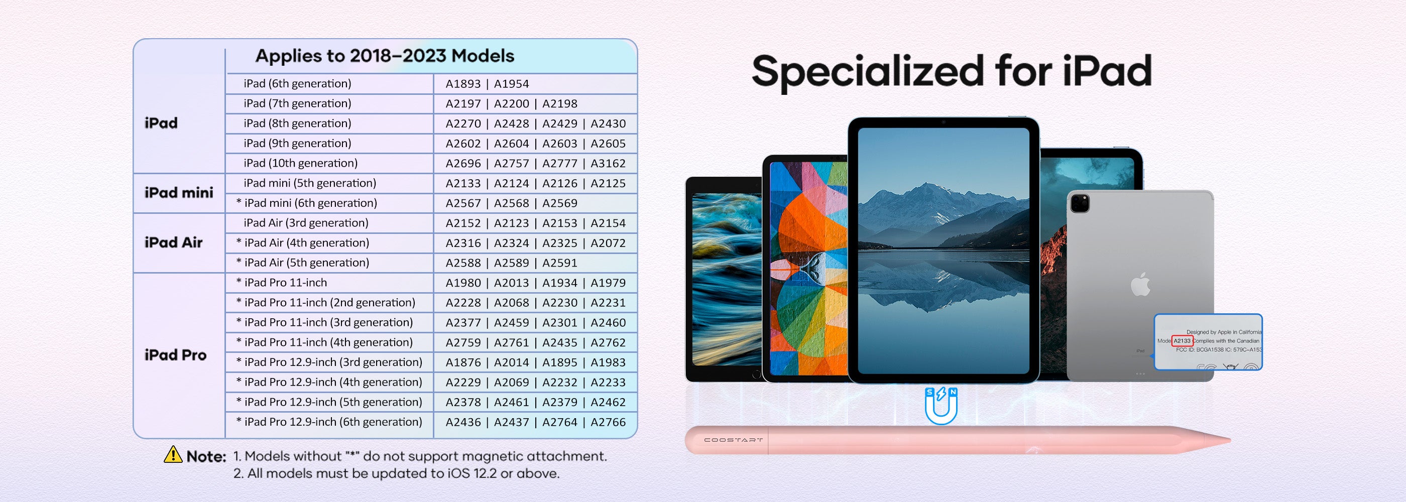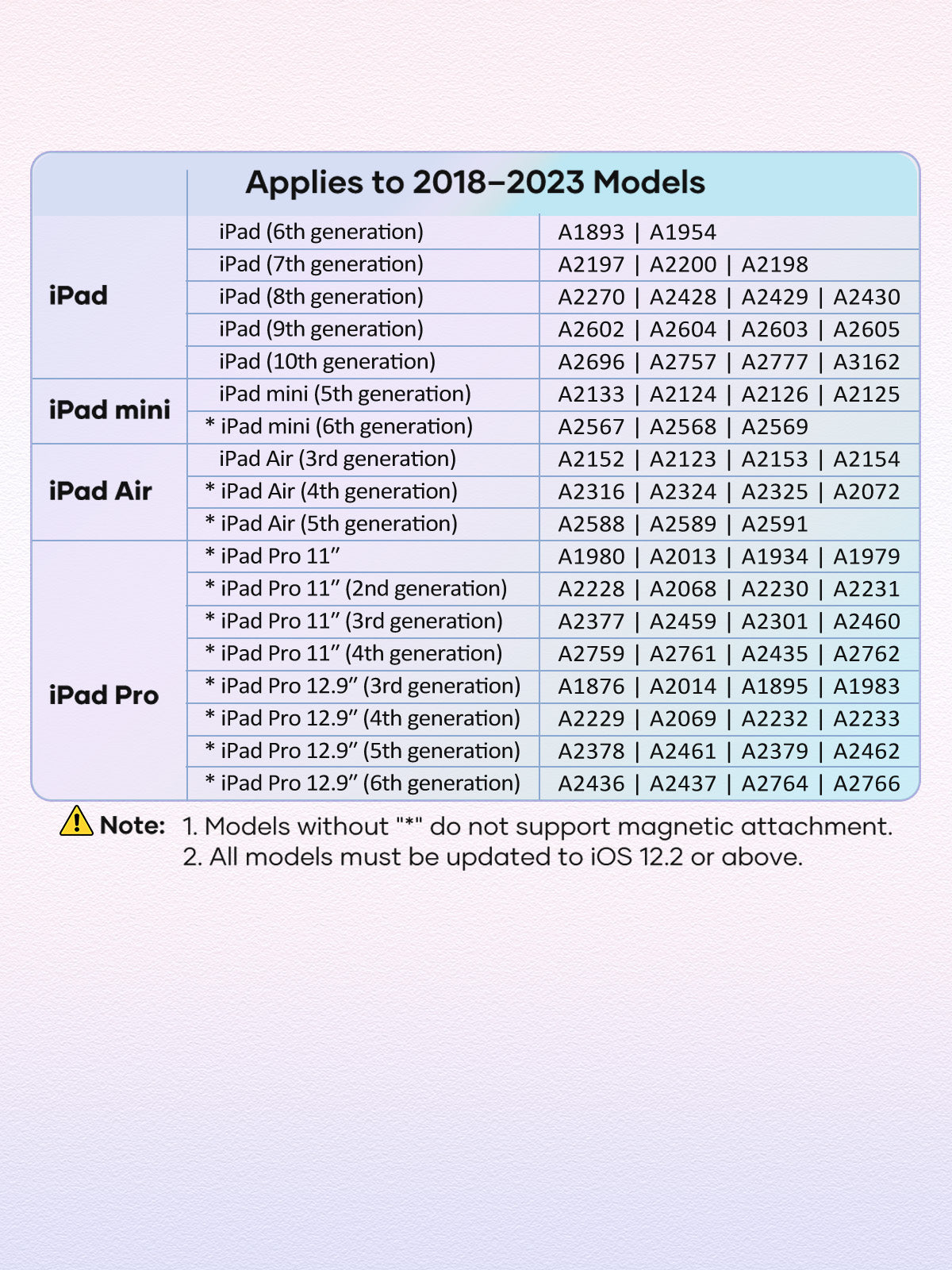 • Compatible with iPad 2018-2023: This stylus is a remarkable alternative for Apple Pencil 1st & 2nd gen.; specifically designed for iPad 10th Generation; iPad 9th, 6th, 7th, 8th Gen.; iPad Air 5th, 3rd, 4th Gen.; iPad Pro 11-inch (1st, 2nd, 3rd, 4th Gen.); iPad Pro 12.9-inch (3rd, 4th, 5th, 6th Gen.); iPad mini 6th & 5th Gen. [NOTE] Not work for iPhone, Android, Microsoft devices, and iPad 2024
