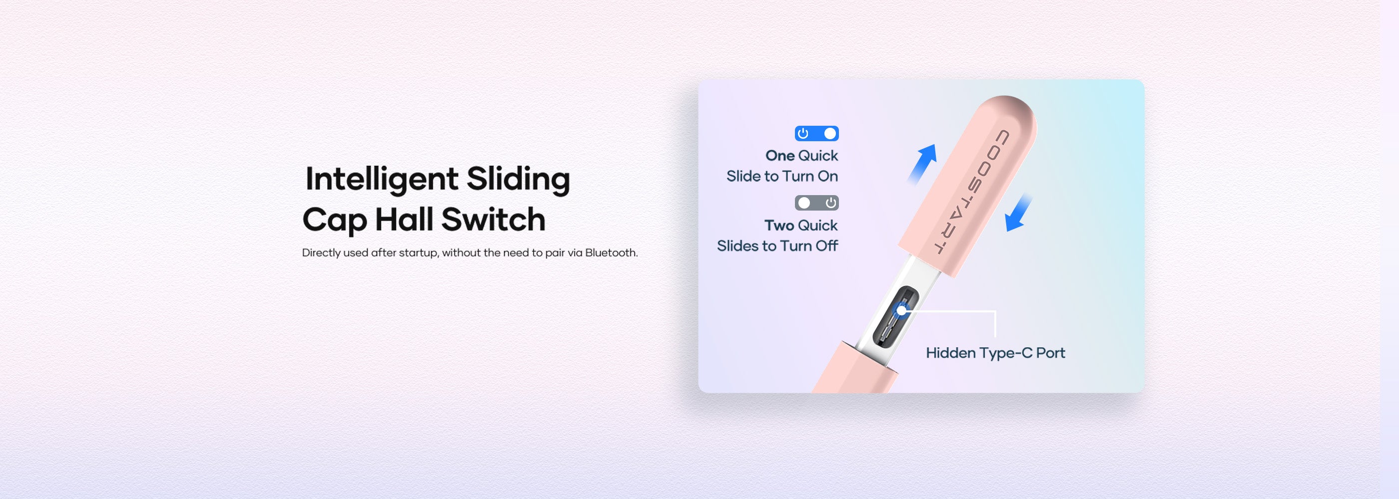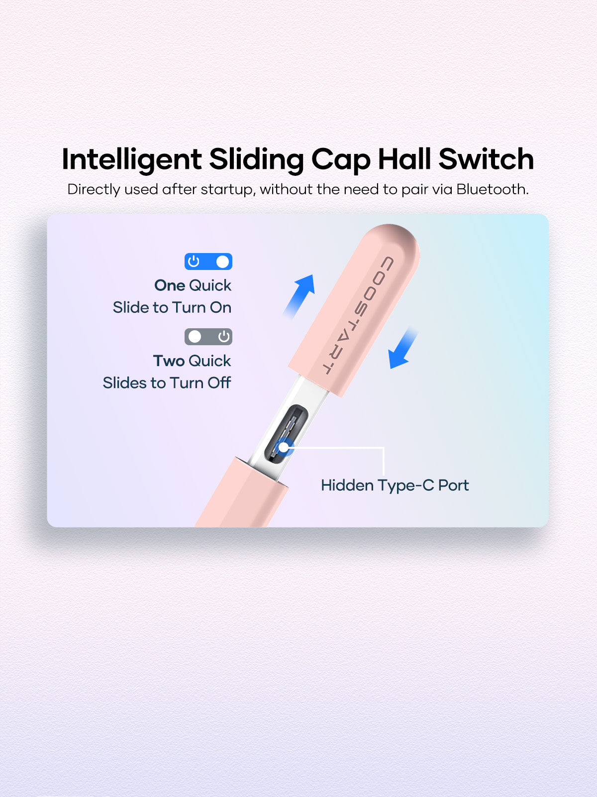 • Pen Cap Switch & Hidden Type-C Port: Directly used after startup. No Bluetooth pairing is needed. Slide the cap once to turn it on, and twice to turn it off. The concealed design protects the USB port and maintains the stylus' aesthetics