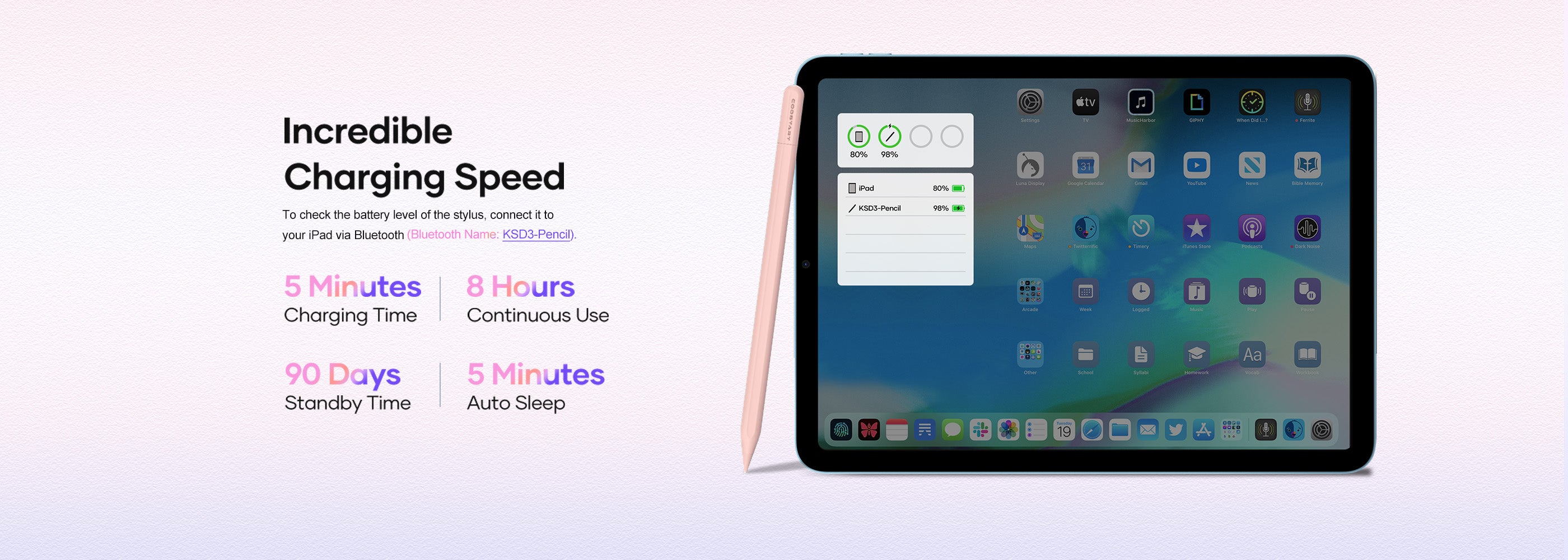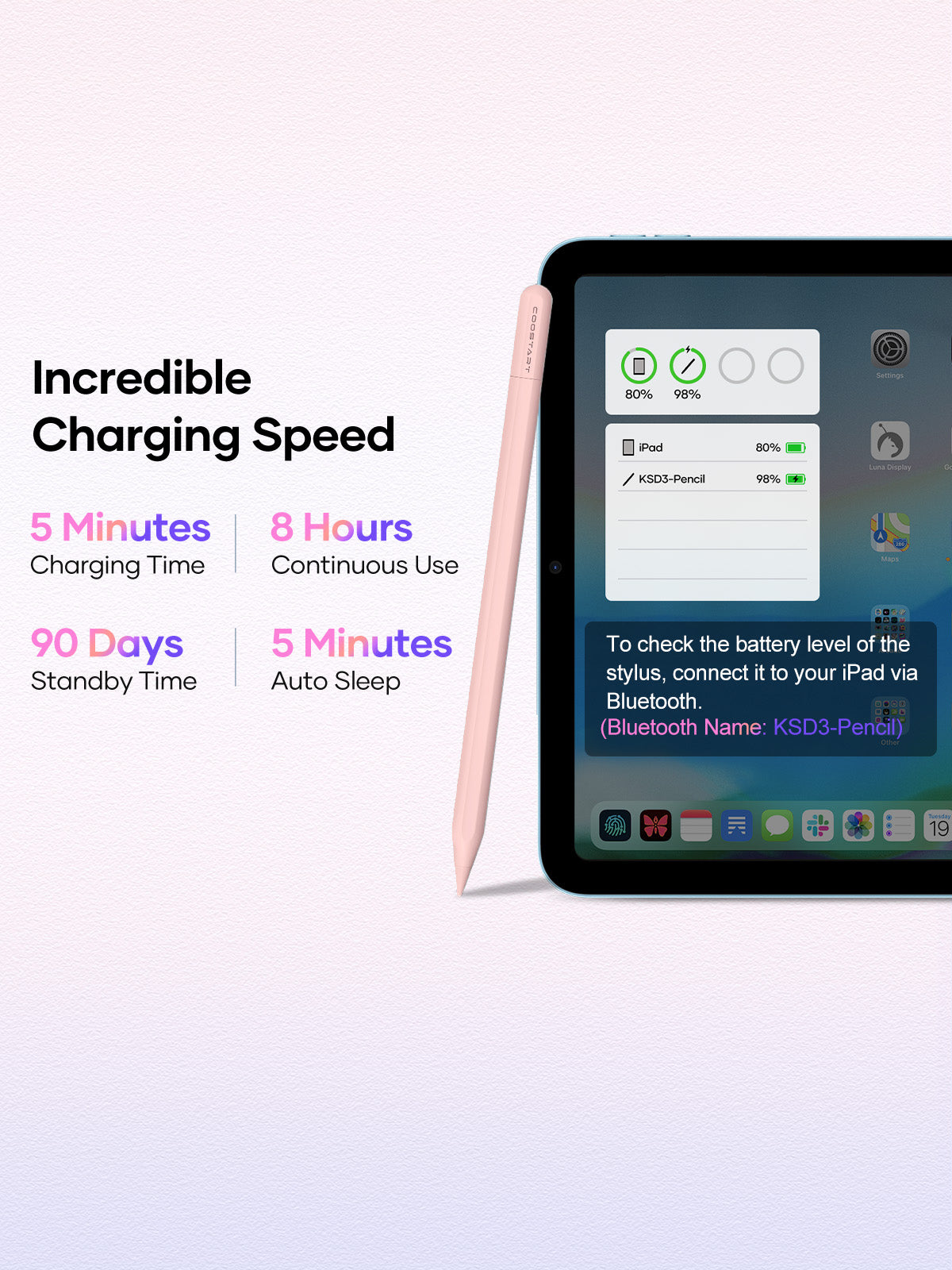 • 5-Minute 100% Charged & Long-Lasting: This stylus pen for iPad offers up to 8-10 hours of continuous use with just 5 minutes of charging. It automatically shuts off after 5 minutes of idle time and provides a standby time of up to 90 days. Once it is connected to the iPad via Bluetooth, you can check the stylus's battery level on the iPad's widget